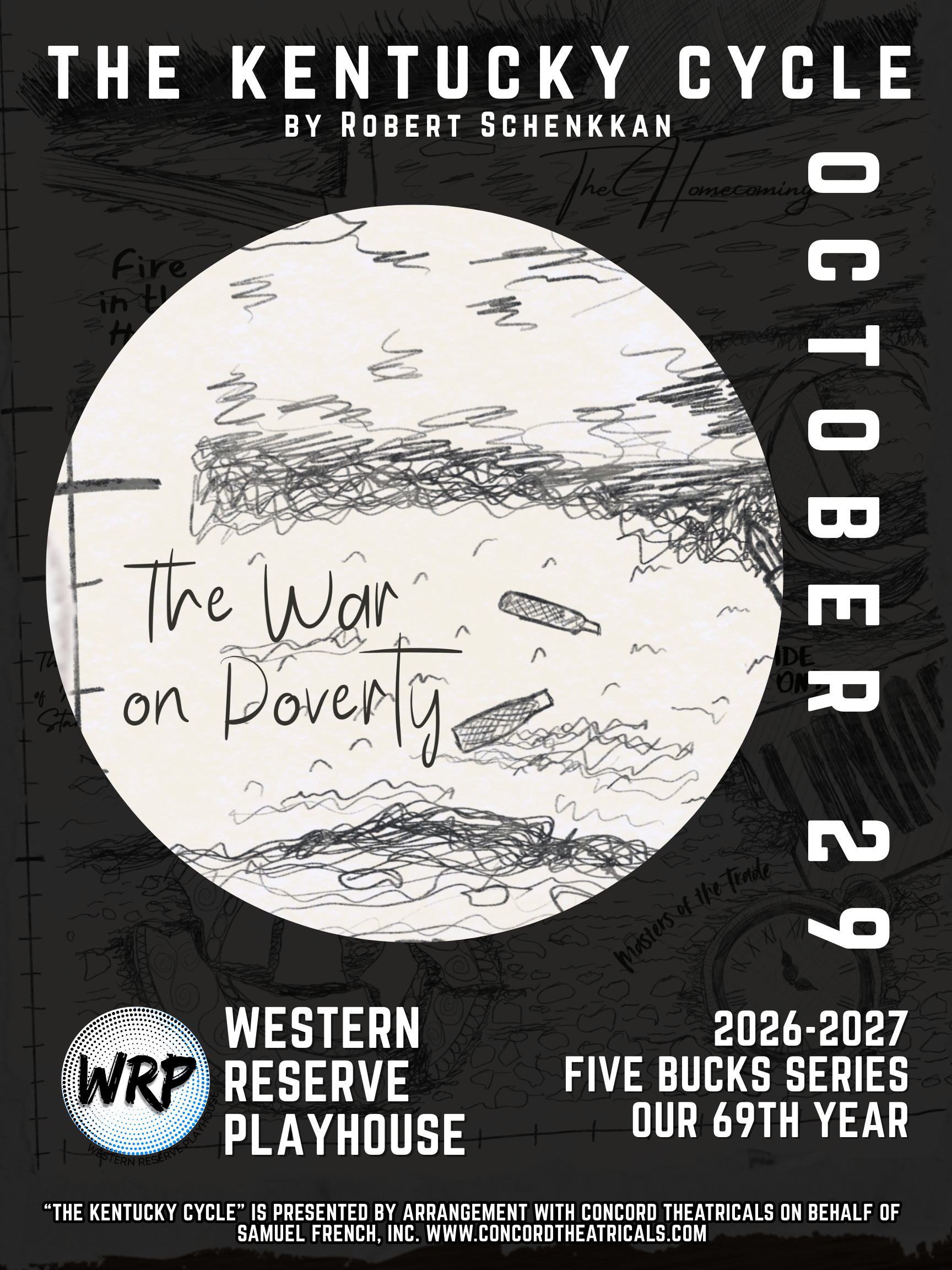 “The Kentucky Cycle” is presented by arrangement with Concord Theatricals on behalf of Samuel French., inc. www.concordtheatricals.com1975. At the original Rowen homestead, Franklin Biggs, James Talbert Winston and Joshua Rowen have gathered with guns and liquor to hunt a wolf rumored to be in the region. They discover an old grave with a beaded buckskin cover with the remains of a baby. Joshua Rowen, ousted from his union post, an embarrassment to his friends, and with his many losses, has finally recognized the tragic flaws that have plagued his family for 200 years. His remorse for the greed and stupidity that have stripped the land of its bounty and his family of any legacy, leads him to give the baby a proper burial, placing beside her the gold watch stolen by the first Rowen two centuries ago. As he kneels beside the grave, all of the dead Rowens rise up behind him, and the curse is put to rest at last.